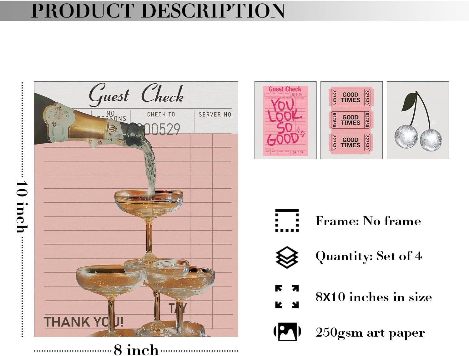 JXREQ Bar Wall Decor, Funky Retro Y2K Champagne Good Times Cherry Disco Ball Posters Wall Art Set of 4, Bar Cart Decor, Trendy Gray Pink Wall Decor for Teen Girl Room Dorm Apartment, 8x10 Unframed