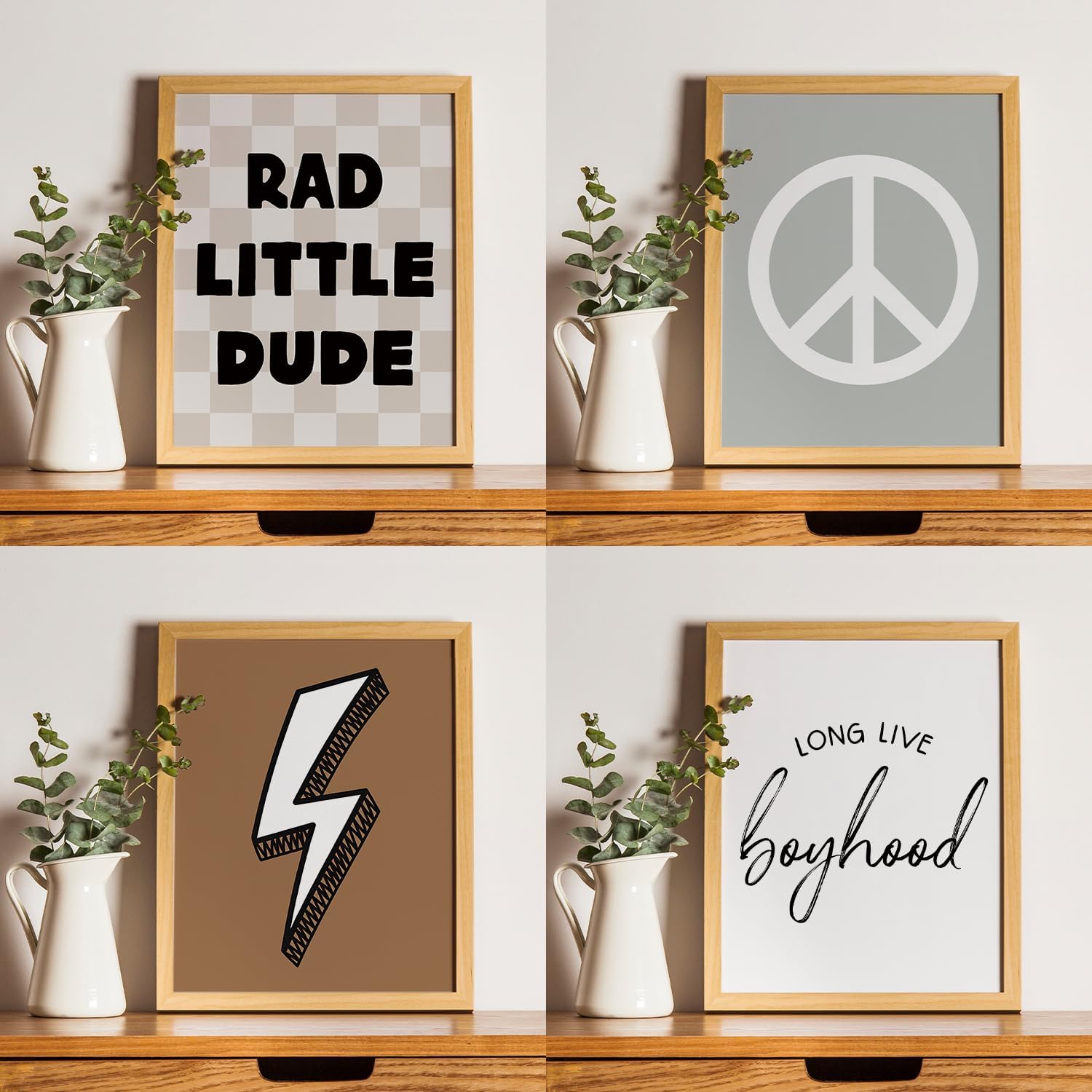 JXREQ Boy Nursery Wall Decor, Long Live Boyhood Trendy Retro Preppy Checkered Peace Sign Lightning Posters Wall Art Prints for Nursery Baby Toddler Boy Room Playroom Set of 4, 8x10 Inch Unframed