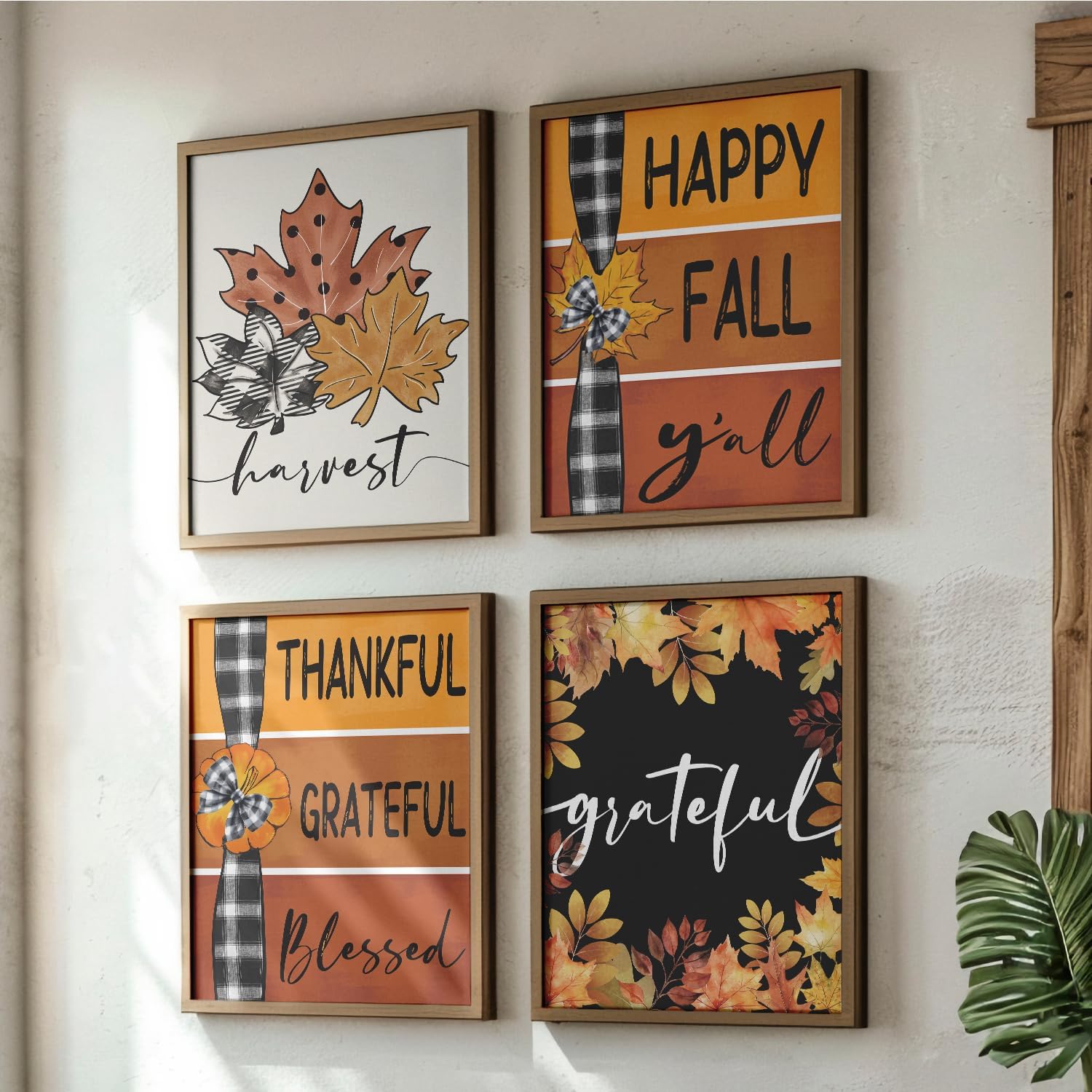JXREQ Fall Decor Pumpkin Thankful Grateful Blessed Maple Leaves Poster Wall Art Decor, Happy Fall Yall Decor Prints Wall Decor for Harvest Thanksgiving Kitchen Bedroom Living Room, 8x10 Inch 4Pcs