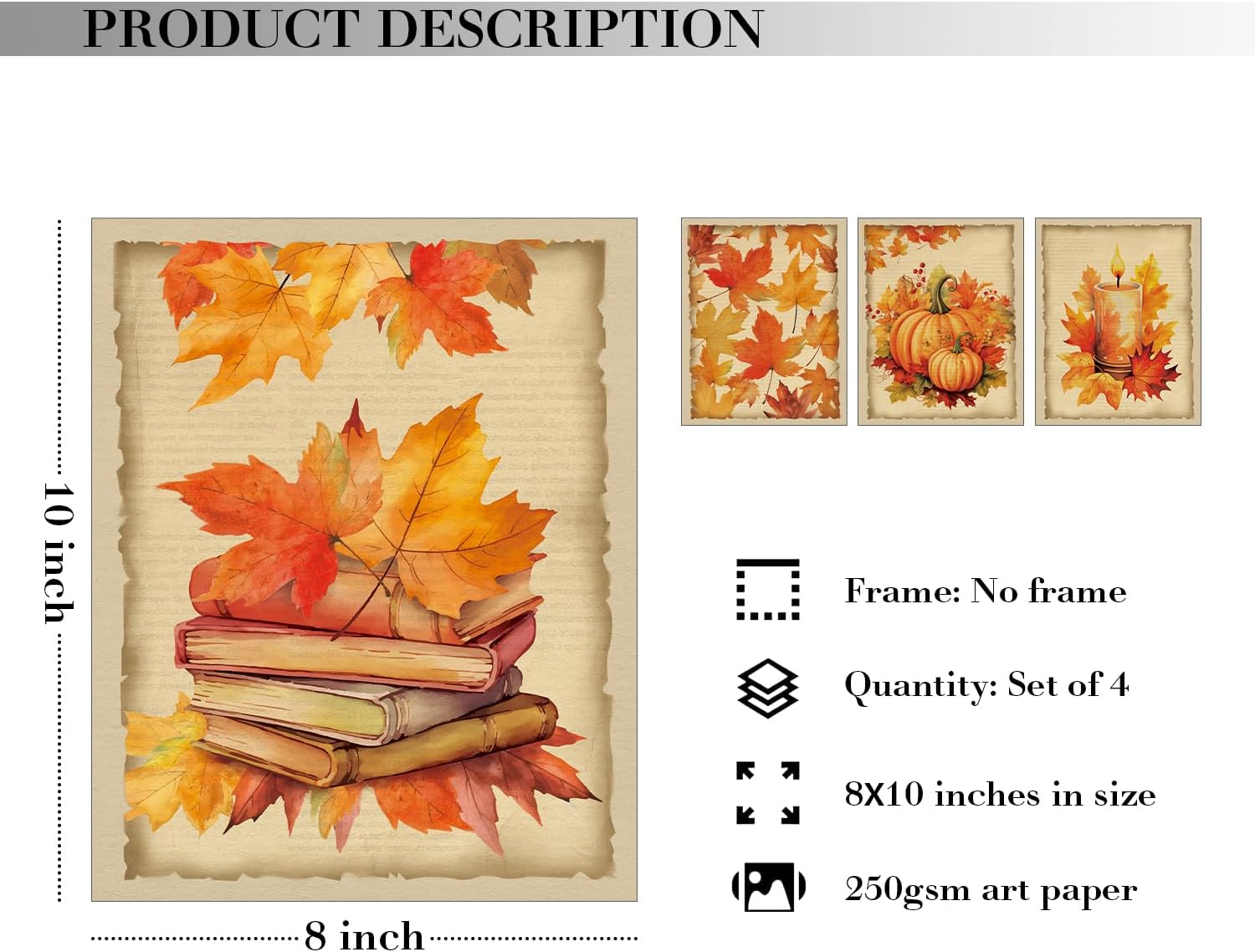 JXREQ Fall Wall Decor, Vintage Fall Pumpkin Autumn Maple Leaves Posters Wall Art Prints Set of 4, Fall Wall Decorations for Home, Fall Thanksgiving Wall Decor, Fall Home Decor, 8x10 Inch Unframed